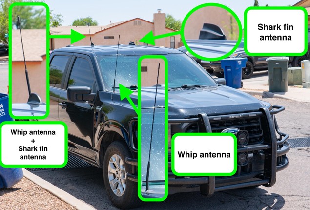 The two most common types of antennas are “whip” antennas and “shark fin” antennas. Sometimes these two types are combined.